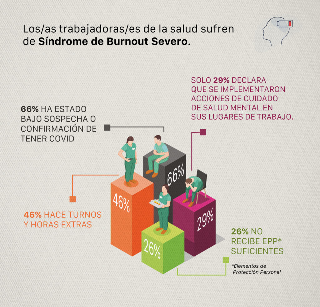 Algunos resultados del estudio fueron alarmantes; reveló, por ejemplo, que un 66% de los funcionarios de la Salud estuvo bajo sospecha de estar contagiado de Coronavirus o dio positivo a la enfermedad. El 46% de los trabajadores que presentaron síntomas de trastornos psiquiátricos asociados al agotamiento, había realizado turnos extras. El 62% de los encuestados ejerció labores clínicas directas con pacientes contagiados. Sin embargo, únicamente, el 29% de los lugares de trabajo adoptaron medidas adicionales para evitar el contagio, mientras que el 26% de los trabajadores aseguró no haber recibido elementos de seguridad personal suficientes.