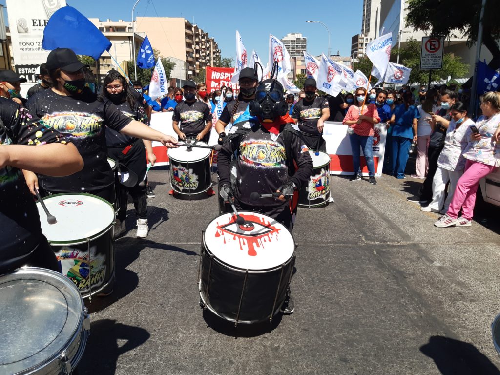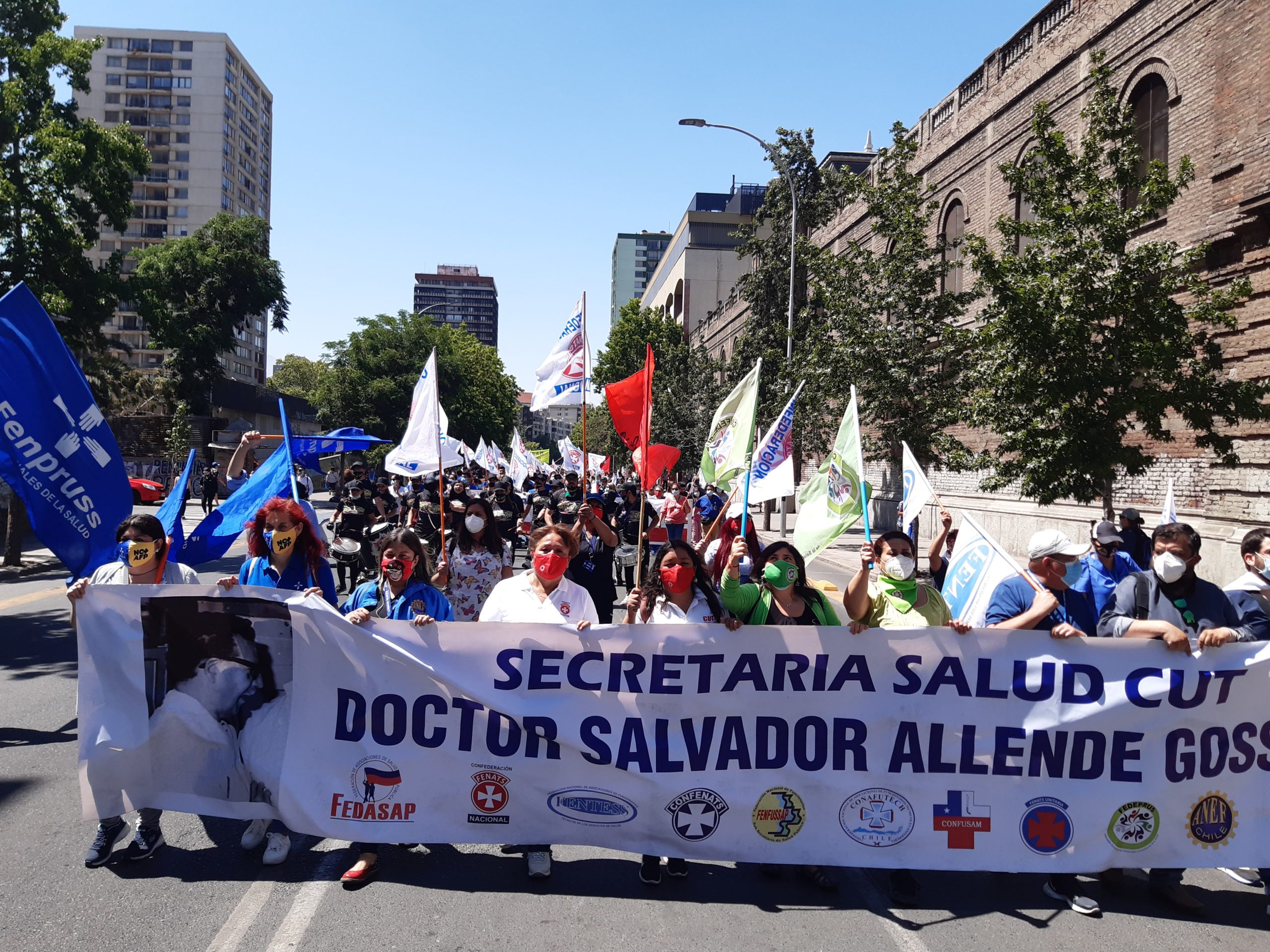 Una multitudinaria marcha de funcionarios de la Salud Pública y Municipalizada se tomó hoy las calles. Varias agrupaciones sindicales, agrupadas por la Secretaría de Salud de la Cut, partieron desde la Posta Central, hasta el frontis del Ministerio de Salud, marchando por la Alameda y luegopor calle Mac Iver. Mientras que una parte de los manifestantes se dirigió hacia La Moneda, copandode esta manera las arterias más importantes del centro de Santiago.