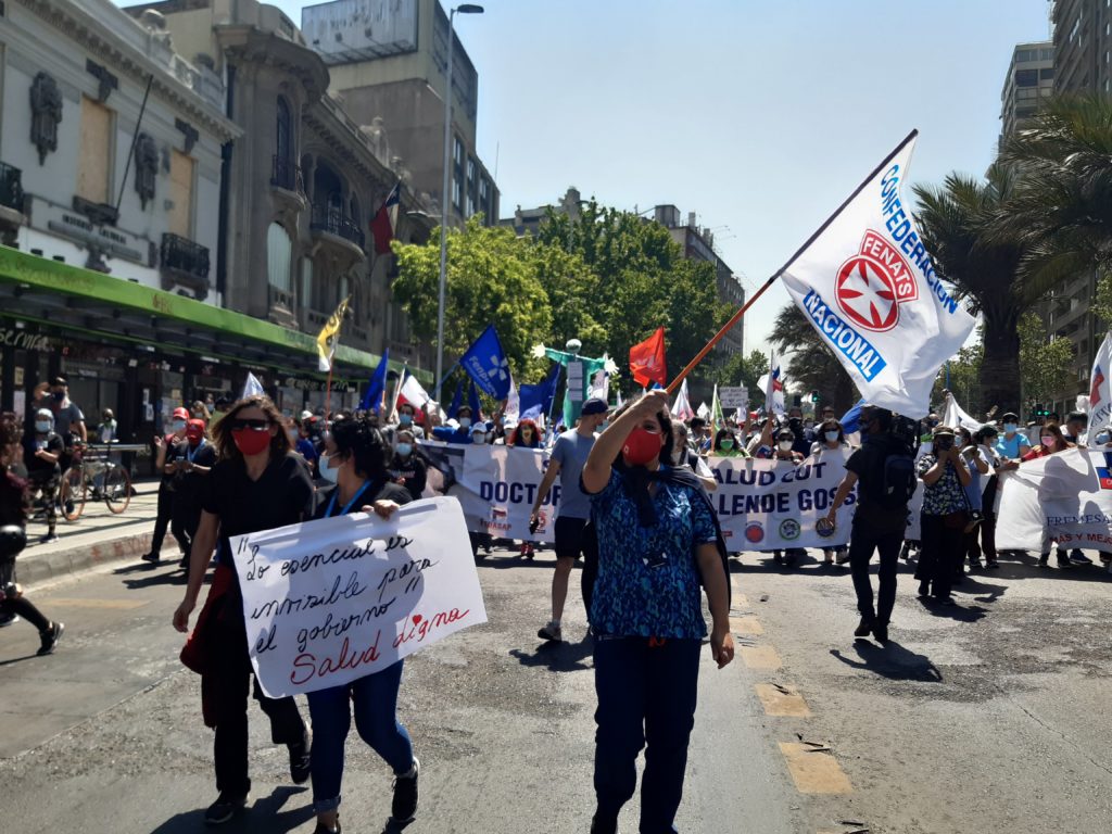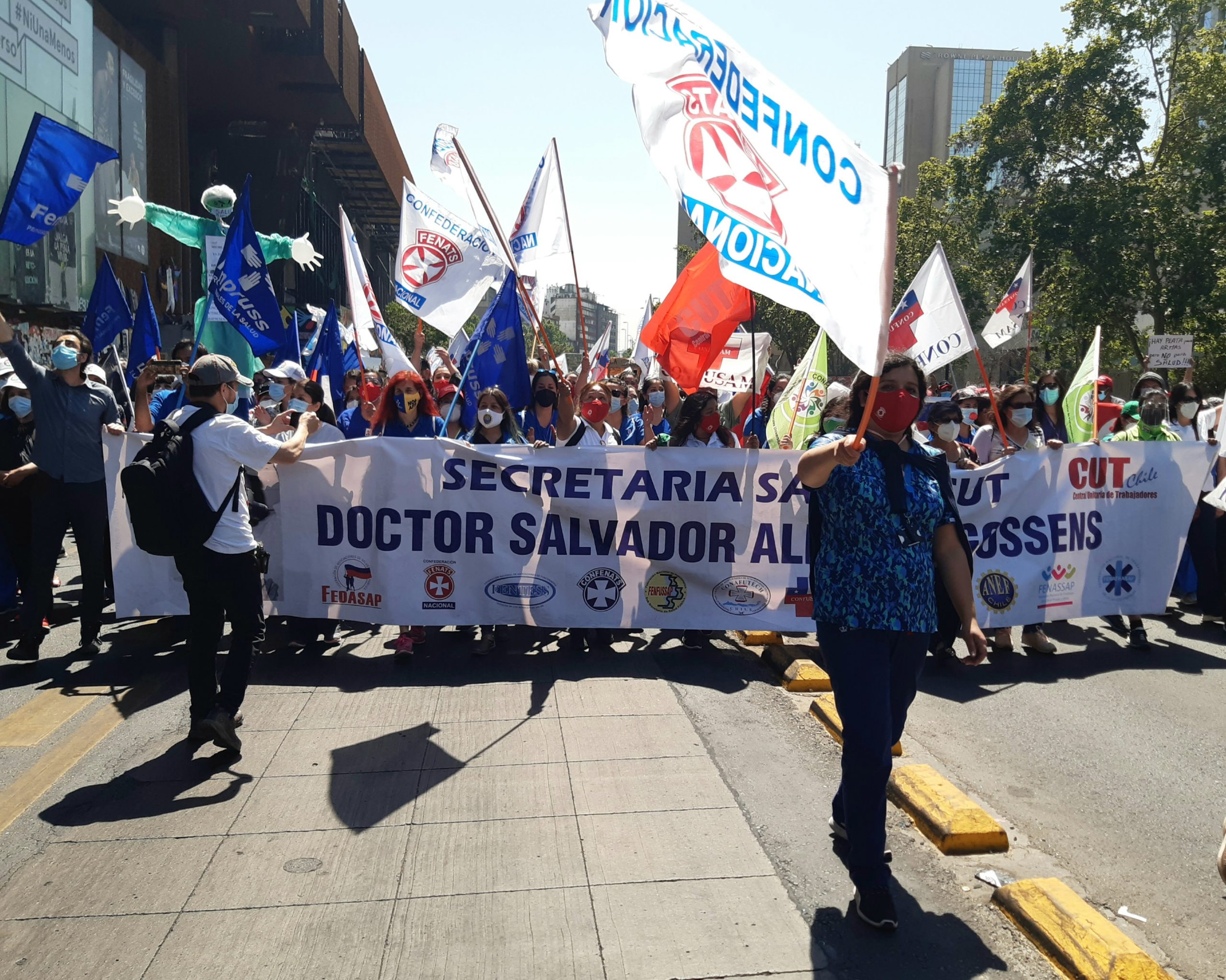 Quince gremios de la Salud se tomaron hoy las calles del país en su primera jornada de paro y  movilizaciones, tendiente a presionar al gobierno a cumplir sus compromisos con el sector. La  evaluación de los dirigentes fue muy positiva, apuntando a la unidad conseguida. No descartan  extender las protestas hasta ser escuchados. En Santiago, marcharon desde la Plaza Dignidad, hasta  La Moneda.