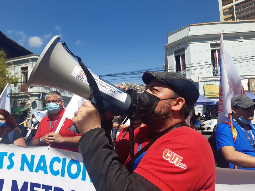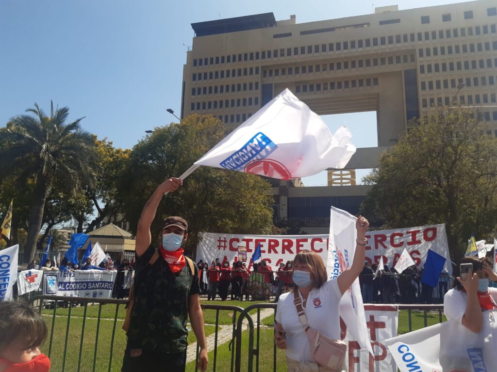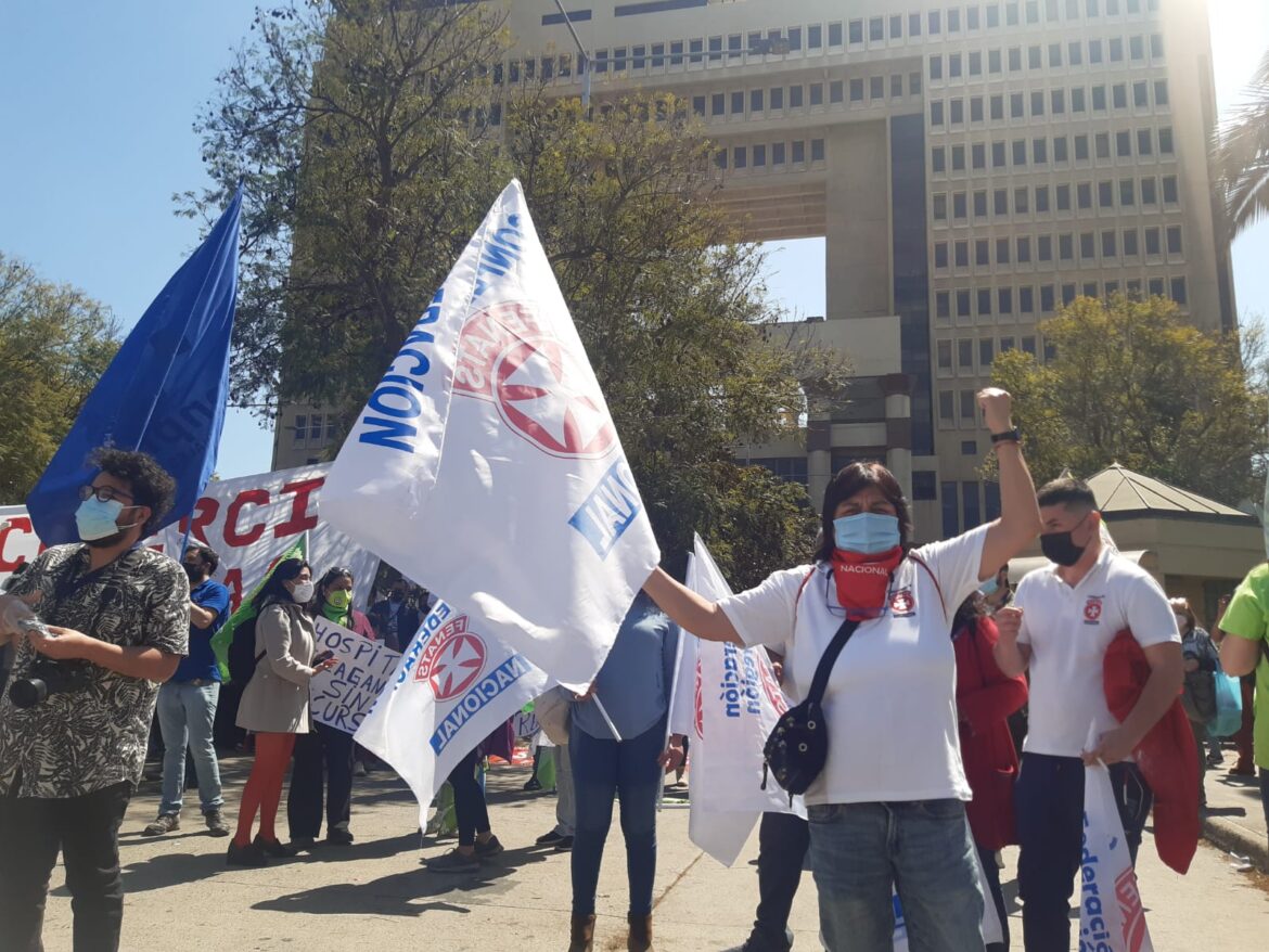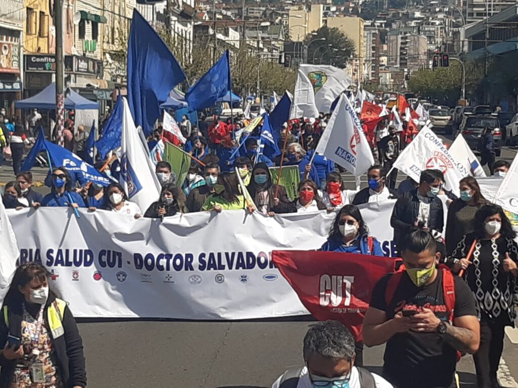 Trabajadores y dirigentes de los 17 gremios de la salud, agrupados bajo la Secretaría de Salud de la CUT, se manifestaron esta mañana por las calles de Valparaíso, marchando hasta el Congreso Nacional, para exigirle al Senado avanzar en los proyectos detenidos allí, como el de Descanso Compensatorio, Fuero Laboral, Metas Sanitarias. Además, defender la permanencia de los funcionarios contratados a honorarios debido a la pandemia, cuyos puestos pretende eliminar el gobierno.