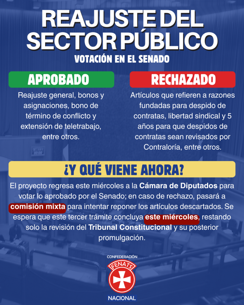 Si bien la Cámara Alta aprobó los montos del Reajuste, vemos con suma gravedad el rechazo a las normativas sobre estabilidad de las contratas y libertades sindicales. El proyecto vuelve a los Diputados este miércoles, donde exigiremos la restitución de estas garantías fundamentales.